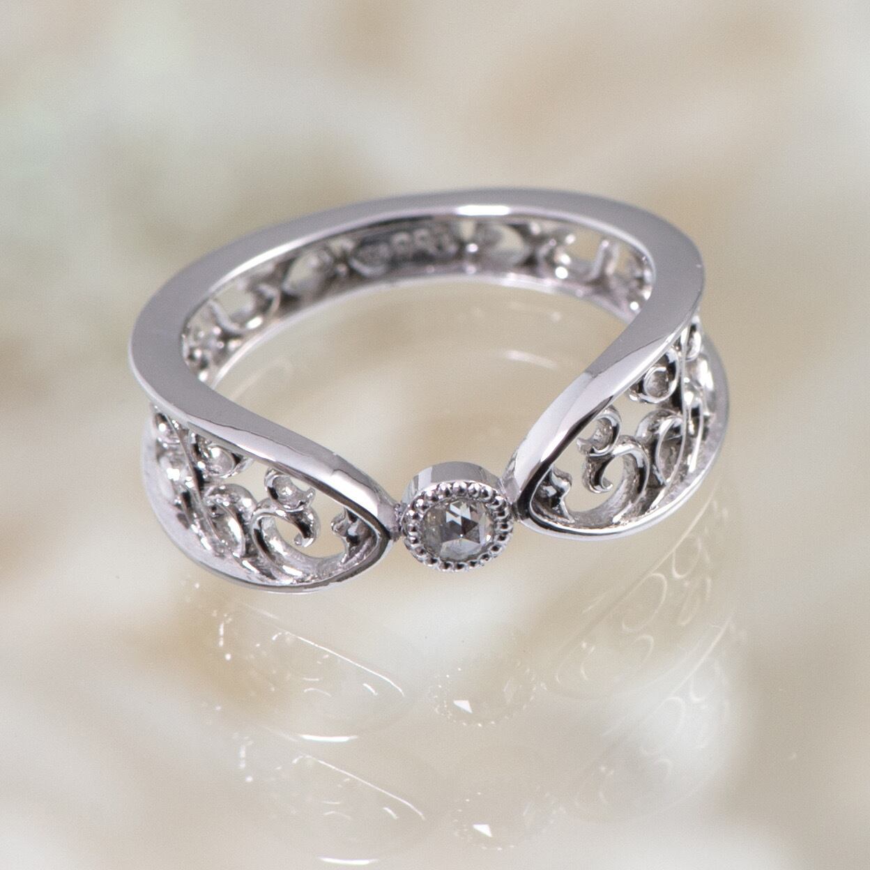 『眠れる森の美女』のお話からインスピレーションをうけて、唐草に包まれたロマンティックなリングが生まれました。