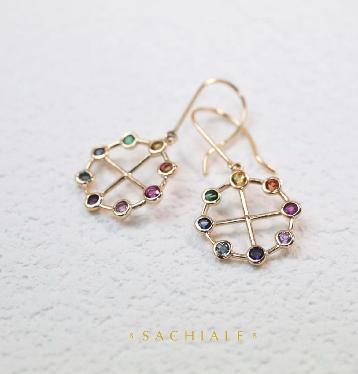 ルビー、オレンジサファイア、イエローサファイア、グリーンガーネット、アクアマリン、ブルーサファイア、アメジスト、ピンクトルマリン
